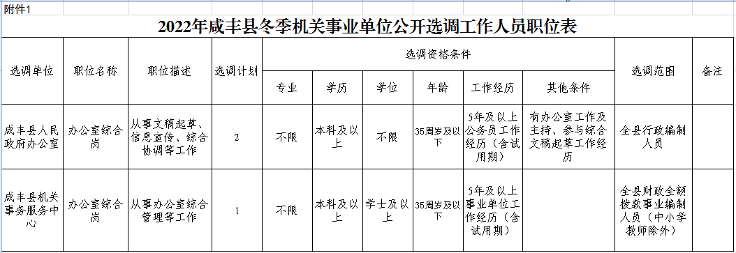 附:1:2022年咸丰县冬季机关事业单位公开选调工作人员职位表