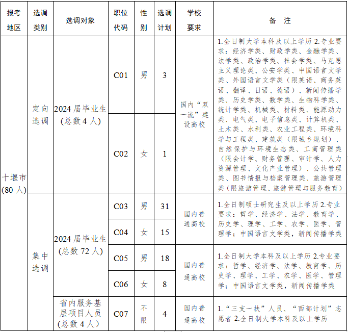 集中选调职位的2024届毕业生,备注中哲学、经济学、法学、教育学、历史学、理学、工学、农学、医学、管理学等门类下所属专业类别均可报考;中国语言文学类、新闻传播学类所属专业均可报考。