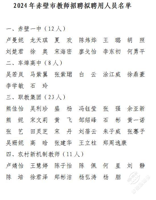 附:2024年赤壁市中小学教师招聘拟聘用人员名单