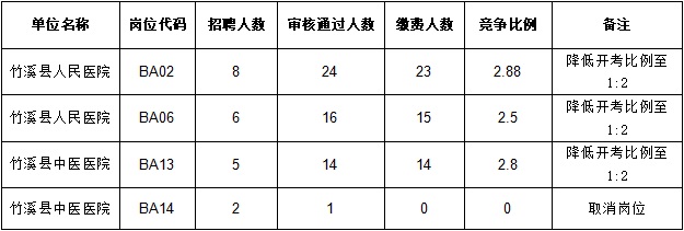 2024年竹溪县事业单位公开招聘工作人员报名工作已结束,根据《2024年竹溪县事业单位公开招聘工作人员公告》有关要求,现将岗位缩减(取消)计划、降低开考比例情况公告如下: