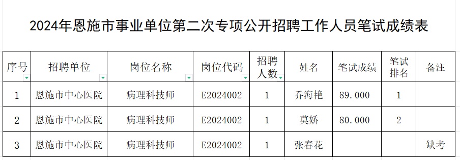 2024年恩施市事业单位第二次专项公开招聘工作人员笔试工作已于2024年11月23日完成,现将笔试成绩予以公告,名单公布如下: