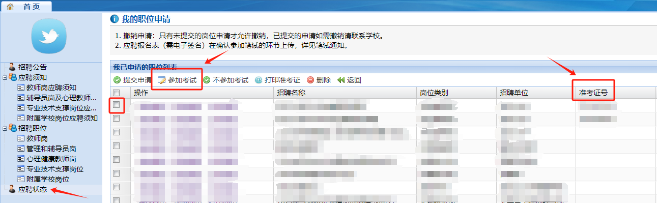 登录武汉大学招聘系统,依次点击“应聘状态”->“参加考试”确认是否参加笔试。确认参加考试的考生可在11月25日后查看准考证号。