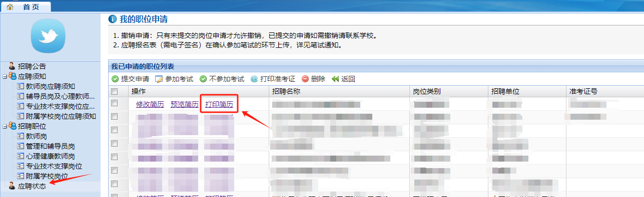 (1)下载应聘报名表。在招聘系统依次点击“应聘状态”->“打印简历”,下载PDF版应聘报名表。