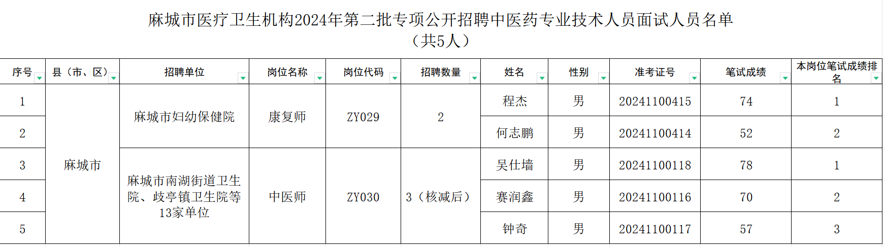 附件:麻城市医疗卫生机构2024年第二批专项公开招聘中医药专业技术人员面试人员名单