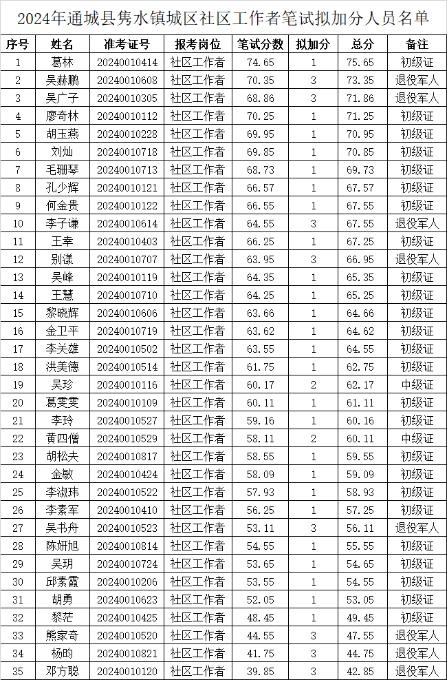 2024年通城县隽水镇城区社区工作者招聘经考生个人申请,相关部门审核,现将符合笔试拟加分人员予以公布。
