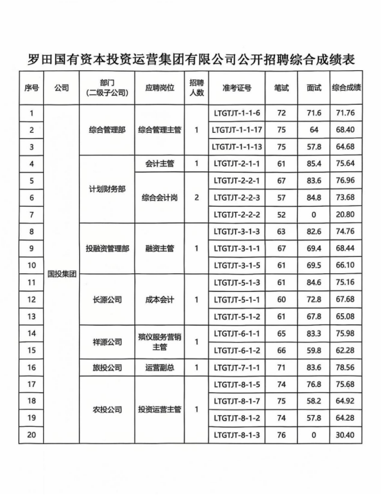 根据2024年11月4日发布的《罗田国有资本投资运营集团有限公司招聘公告》及11月15日发布的《罗田国有资本投资运营集团有限公司公开招聘调整公告》要求,国投集团本着公开、公平、公正的原则,全权委托前锦网络信息技术(上海)有限公司武汉分公司命题并组织报考人员统一笔试、面试,独立阅卷,在相关部门监督下,已于2024年12月13日完成面试工作,现将综合成绩公示如下: