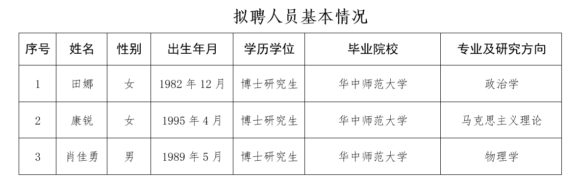 根据《湖北民族大学2024年人才引进公告》有关要求,经面试和考核,现将湖北民族大学2024年度人才引进拟聘人员名单予以公示。公示期从2024年12月16日至12月24日。