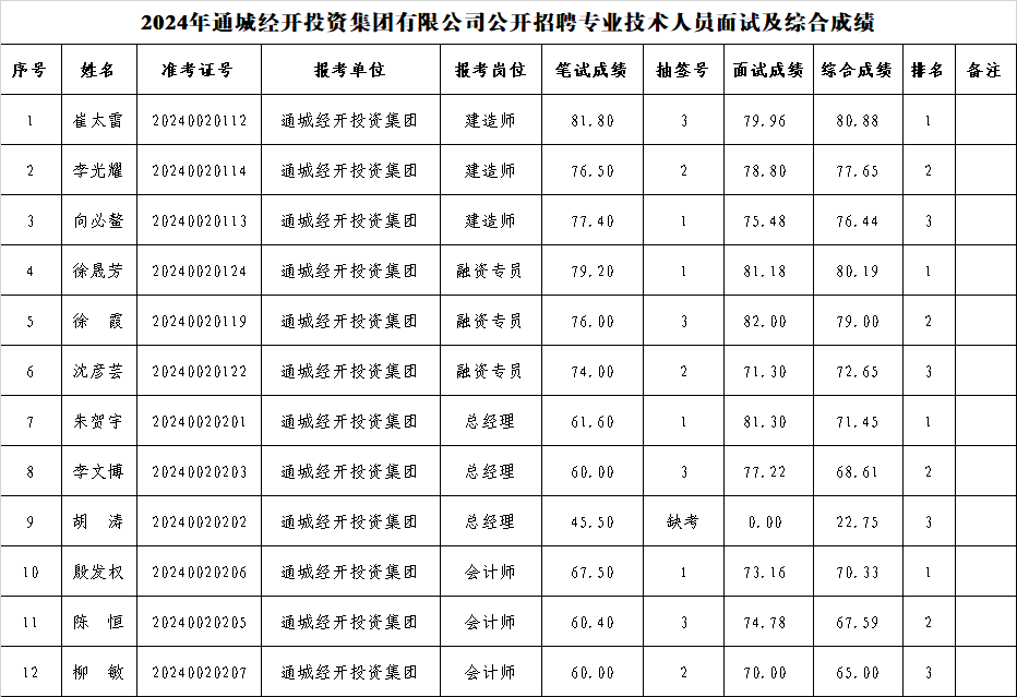 2024年通城经开投资集团有限公司公开招聘专业技术人员已按程序和要求完成了面试考务工作,现将面试及综合成绩予以公布。