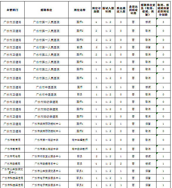 根据《2024年广水市公开引进高层次和急需紧缺人才公告》规定,本次公开引进报名时间截止后,部分招聘岗位因报名人数达不到规定的开考比例,用人单位提出取消、核减或者保留岗位的申请,主管部门核准后报广水市人社局备案,具体情况如下: