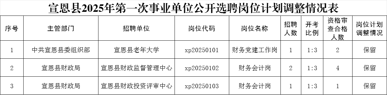 根据2025年1月7日发布的《宣恩县2025年第一次事业单位公开选聘工作人员公告》关于开考比例的规定,以及考生报名情况,对《宣恩县2025年第一次事业单位公开选聘工作人员岗位计划表》中未达到开考比例的岗位,经招聘单位申请,主管部门研究,现对岗位计划调整情况予以公告。