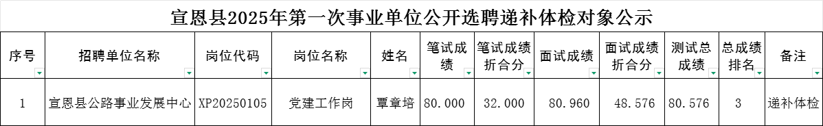 根据《宣恩县2025年第一次事业单位公开选聘工作人员公告》和《宣恩县2025年第一次事业单位公开选聘测试总成绩公示及体检工作安排》精神,现就部分选聘岗位递补体检对象的情况及有关事项公告如下:
