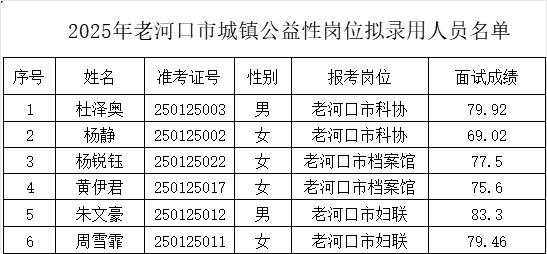 根据《关于进一步做好公益性岗位开发管理有关工作的通知》(鄂人社发〔2020〕52号)、《老河口市公益性岗位管理实施办法》(河人社发〔2023〕64号)和《老河口市公益性岗位开发流程》(河就工办发〔2024〕5号)等文件精神,经组织考试,拟录用杜泽奥等6人作为公益性岗位人员,现予以公示,公示期从即日起5天。根据公告中因自愿放弃或不能胜任工作等情况,产生职位空缺的,可根据考试总成绩从高分到低分进行递补,成绩有效期为三个月。社会公众有异议的,请向市人社局反映,联系电话0710-8306870。