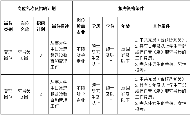 因工作需要,我校现通过湖北省事业单位2025年统一公开招聘平台,面向社会公开招聘专职辅导员6人,具体岗位及报考条件如下: