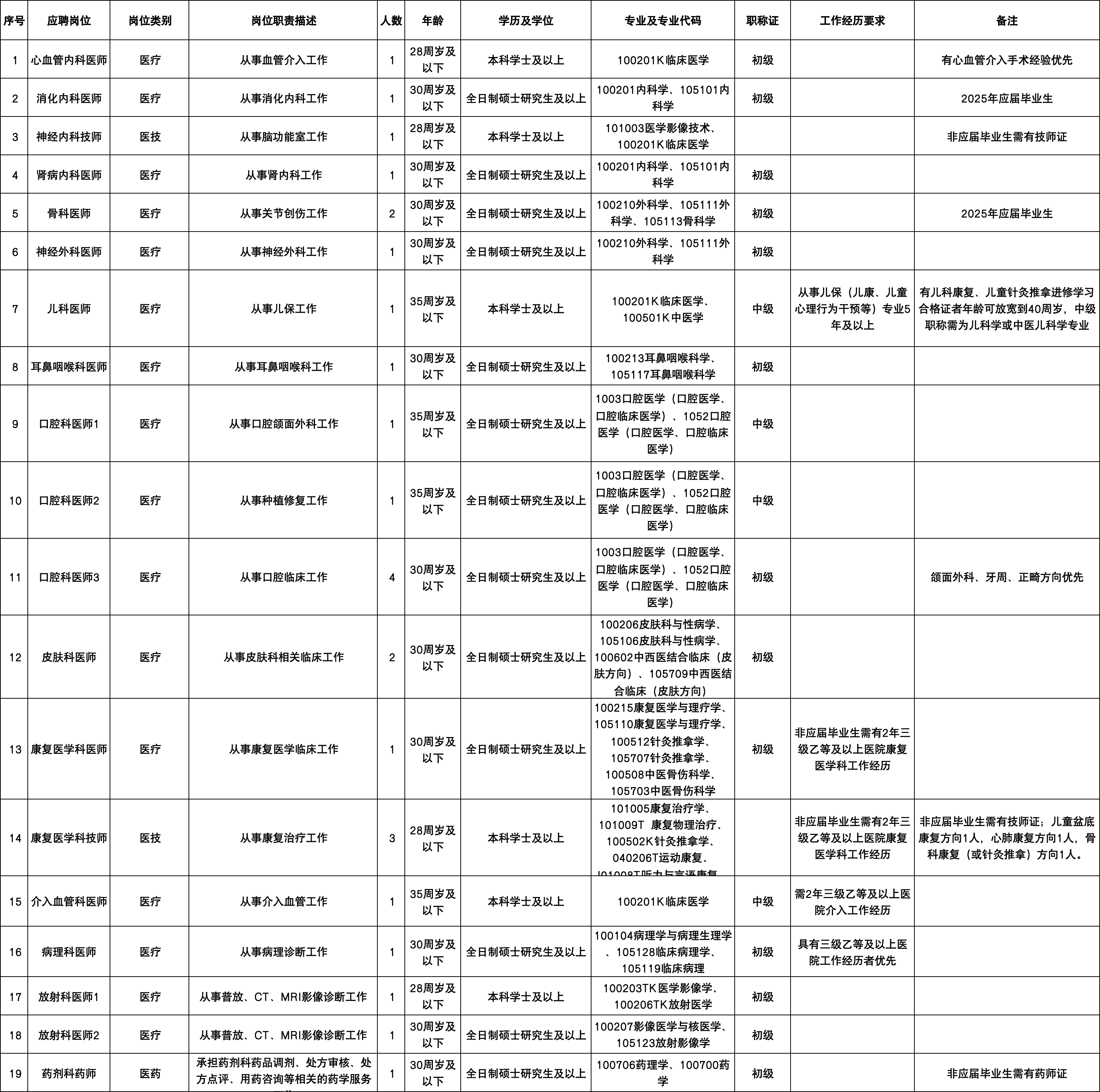 1.学历、资质要求:起点学历要求为全日制统招本科(不含“中起本”“专升本”“专套本”等),应届毕业生应在2025年7月31日前取得各阶段的学历和学位证书,非应届毕业生须在资格审核时已取得各阶段的学历和学位证书,其中应届毕业生指2025年当年毕业应届毕业生(含面向社会招收的普通高校应届毕业生在2025年住院医师规范化培训合格的);医师(医疗岗位)需具备执业医师证和住院医师规范化培训合格证(原则上规培方向与岗位一致),原则上中级岗位不作规培要求,应届毕业生应于2025年7月31日前取得相应专业规培证,若遇上级延迟考试时间,则应于相应时间内取得,否则将被取消录用资格,解除劳动合同;非应届毕业生报考药师岗位需取得初级药师证,应届毕业生需在入职后首次符合卫生专业技术资格考试报名条件时参加考试并一次性通过,否则将被取消录用资格,解除劳动合同;非应届毕业生报考技师岗位需取得相应岗位的初级证,应届毕业生需在入职后首次符合卫生专业技术资格考试报名条件时参加考试并一次性通过,否则将被取消录用资格,解除劳动合同。具体要求详见各招聘岗位。