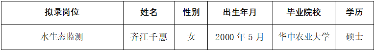 根据《湖北中水长江生态保护研究院有限公司公开招聘公告》要求,经完成相关招聘程序,研究决定拟录用齐江千惠为长江生态公司工作人员,现将有关基本情况予以公示。公示期间,如对拟录用人选有异议,请向公司综合部反映。