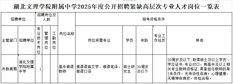 (一)湖北文理学院附属中学拟公开招聘紧缺高层次专业人才 1名。岗位条件详情见《湖北文理学院附属中学2025年度公开招聘紧缺高层次专业人才岗位一览表》。