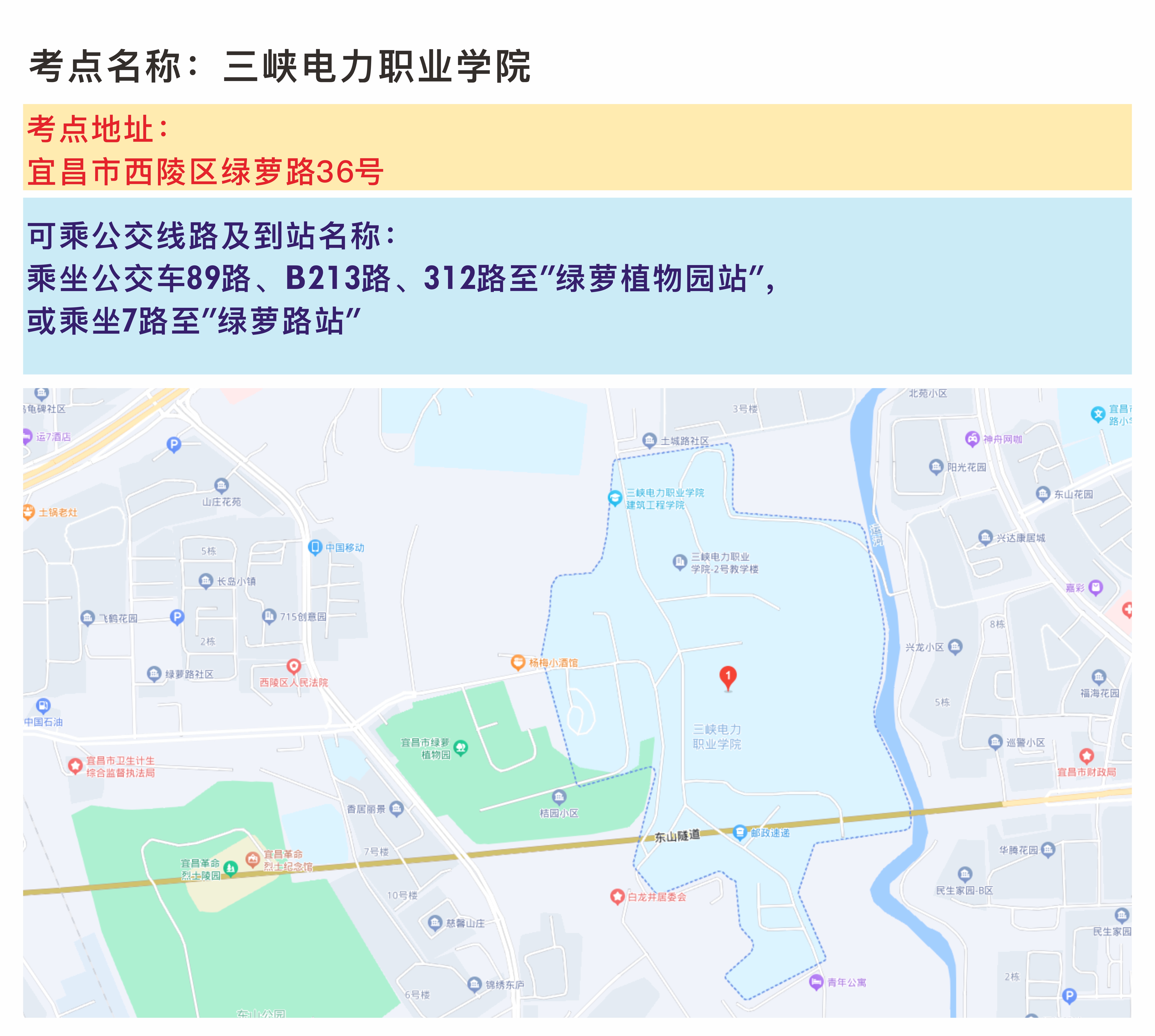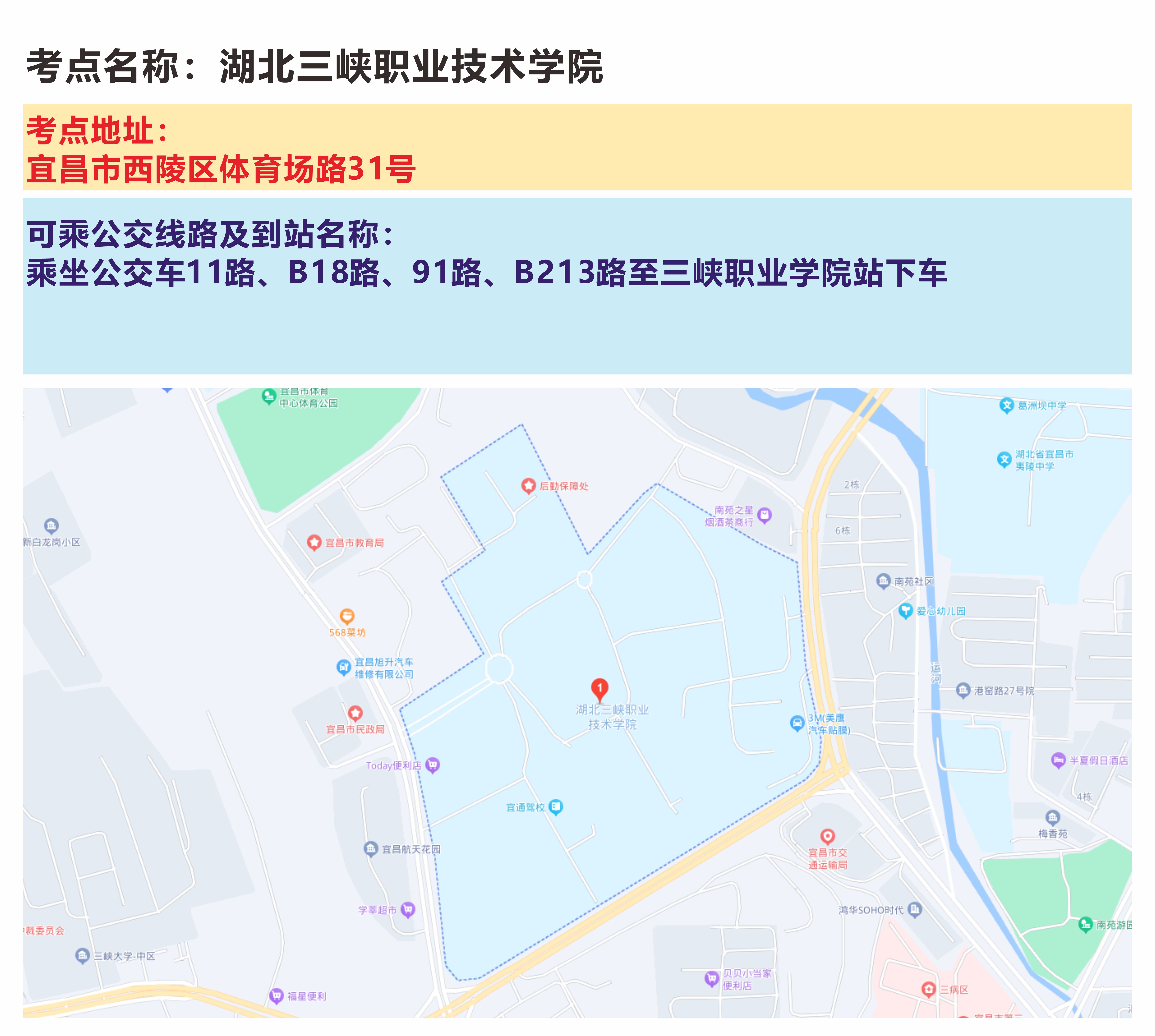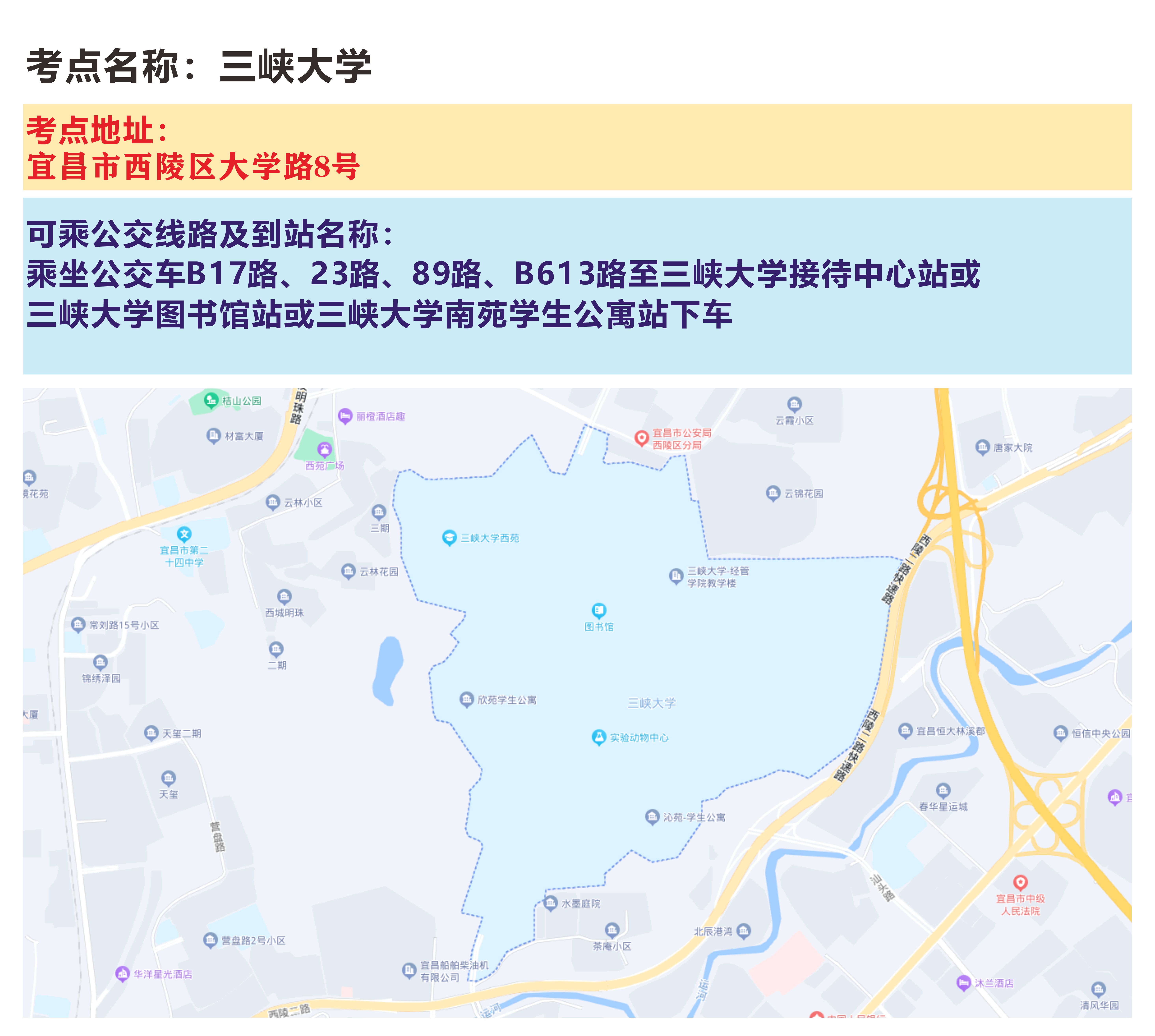 3.提前熟悉考点环境。请考生提前规划好赶考路线,注意天气变化,做好充分准备。建议考试前一天熟悉考点学校地址、交通路线,避免因堵车或走错考点等原因影响参加考试。特别是三峡大学当天校内同步有其它活动进行,请考生尽量选择公共交通工具出行。