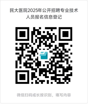 1.采取网上报名方式,考生扫描报名登记二维码(见附件1)登记相关信息,并填写《湖北民族大学附属民大医院2025年公开招聘专业技术人员报名表》(见附件2),由湖北民族大学附属民大医院人力资源部受理。网上报名电子邮箱地址:mdyyrs@126.com。