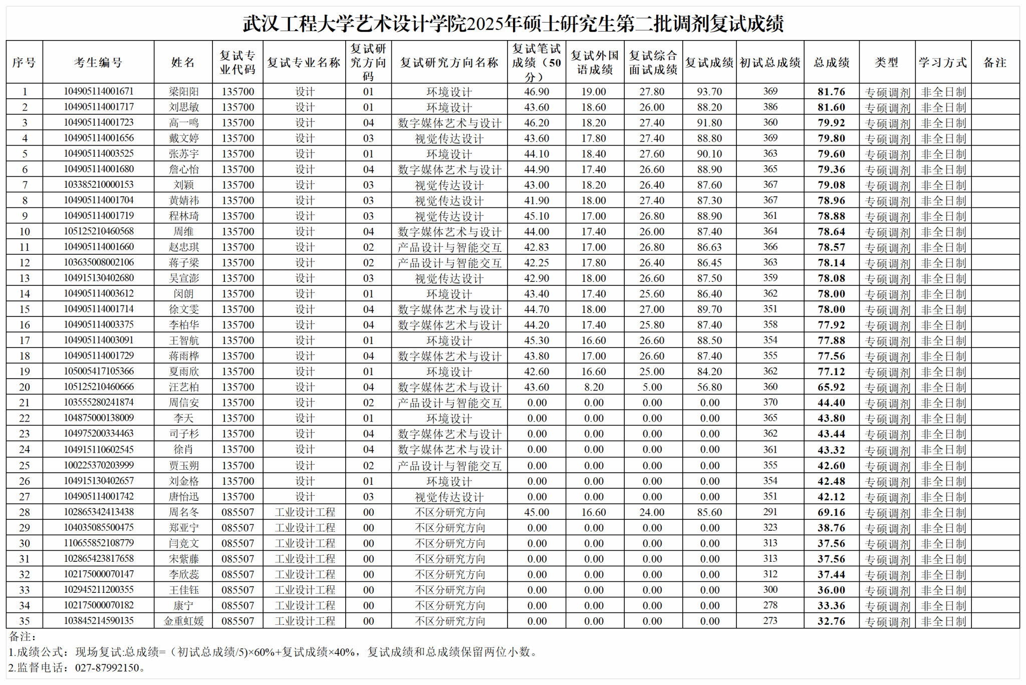 武汉工程大学艺术设计学院2025年硕士研究生第二批调剂复试成绩