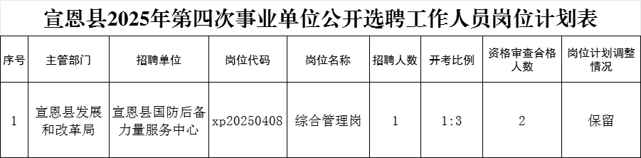 根据2025年4月10日发布的《宣恩县2025年第四次事业单位公开选聘工作人员公告》关于开考比例的规定,以及考生报名情况,对《宣恩县2025年第四次事业单位公开选聘工作人员岗位计划表》中未达到开考比例的岗位,经招聘单位申请,主管部门研究,现将岗位计划调整情况予以公告。