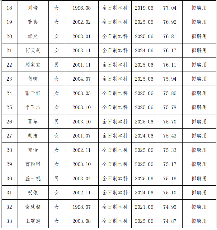 湖北省中医院(湖北中医药大学附属医院)因业务发展需要,面向社会公开招聘编外聘用护理人员,经个人报名、资格审核、笔试、综合面试、临床考核、总成绩公示和体检环节,现将拟聘人员予以公示。