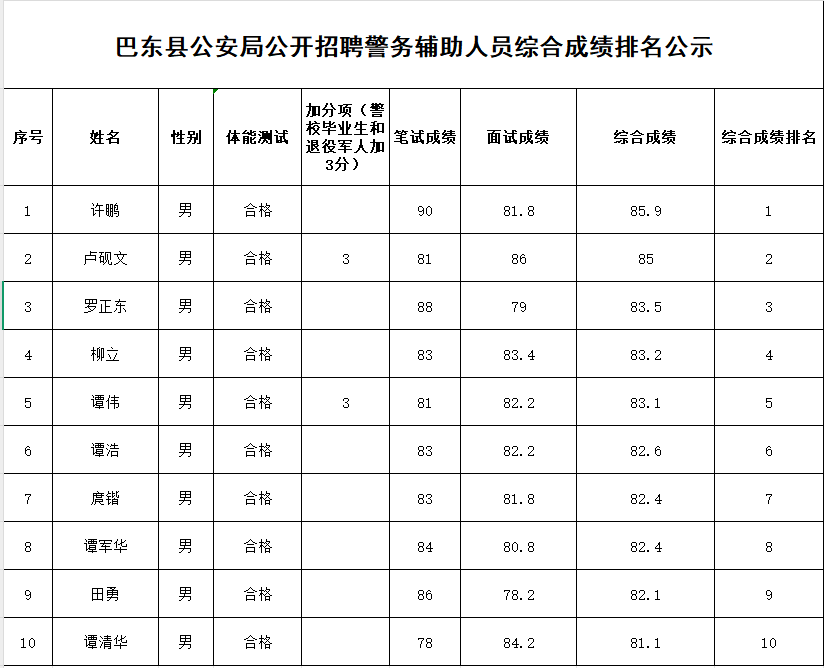 按照“公开、平等、竞争、择优”和德才兼备的原则,巴东县公安局面向社会公开招聘10名看护警务辅助人员,于4月29日结束面试,现将考生综合成绩排名向社会公示。