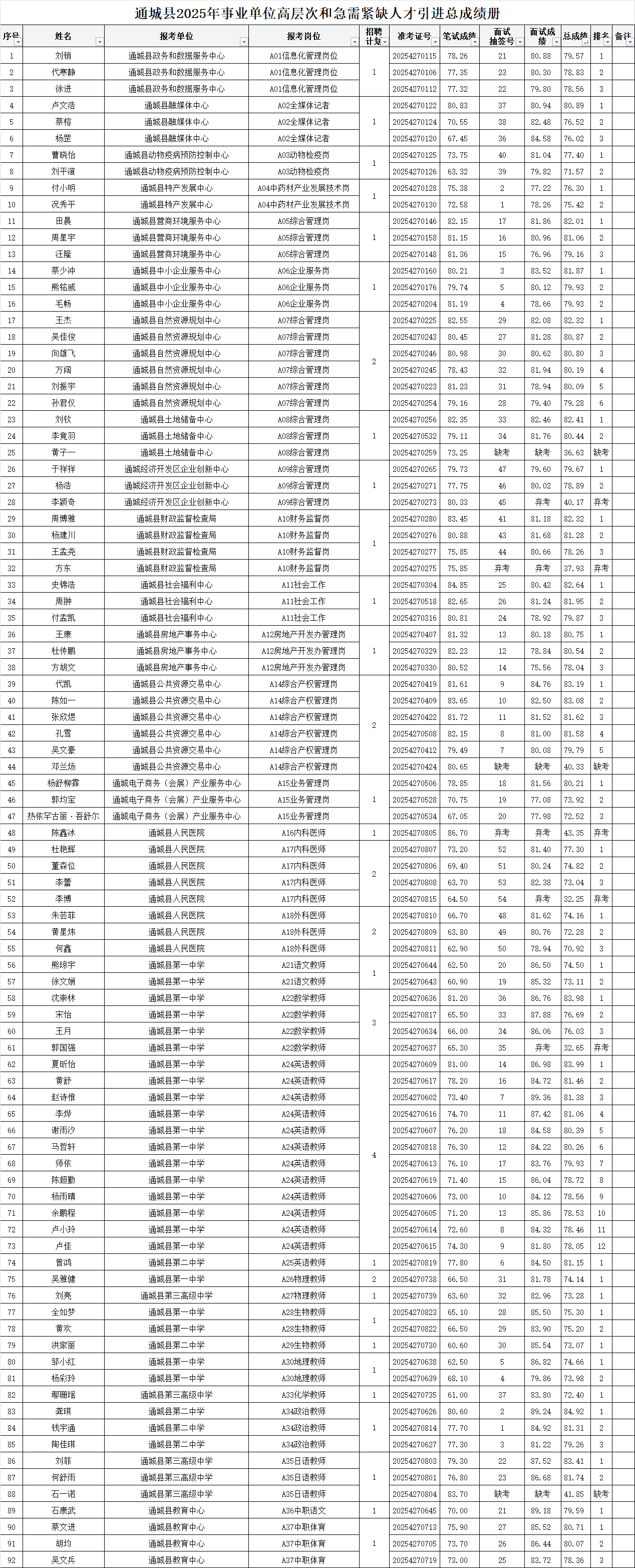 通城县2025年事业单位高层次和急需紧缺人才引进已按程序和要求完成了笔试、面试考务工作,现将总成绩予以公布。