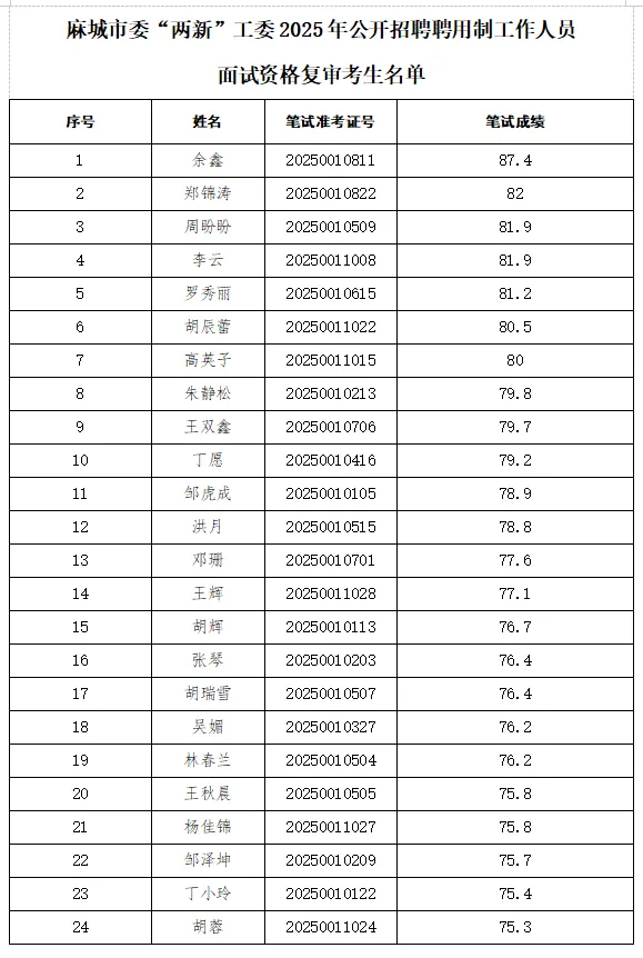 根据《麻城市委“两新”工委2025年公开招聘聘用制工作人员公告》,为做好麻城市委“两新”工委2025年公开招聘聘用制工作人员面试资格复审工作,现将相关事项通知如下: