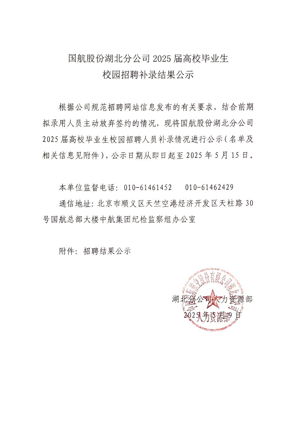 国航股份湖北分公司2025届高校毕业生校园招聘补录结果公示