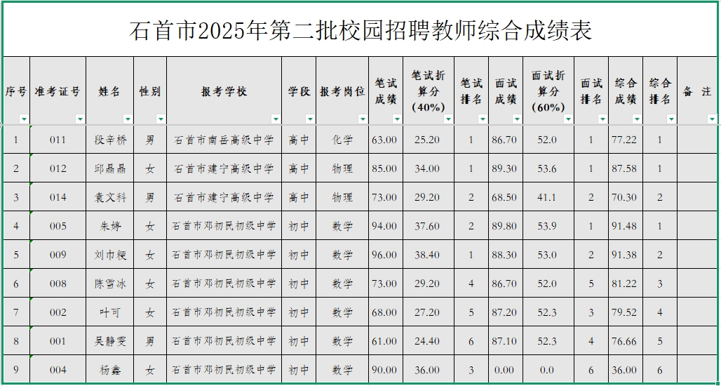 根据《石首市2025年第二批校园招聘教师公告》的有关要求,石首市2025年第二批校园招聘教师笔试、面试已于2025年5月12日、13日完成,现将笔试、面试和综合成绩(见附件)予以公示。