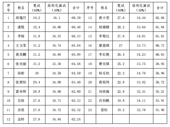 根据《汉川市人民医院/武汉大学人民医院汉川医院2025年度人才招聘考试实施方案》,我院于2025年5月17日对护理岗位应聘人员进行了笔试和结构化面试,现将综合成绩予以公示。