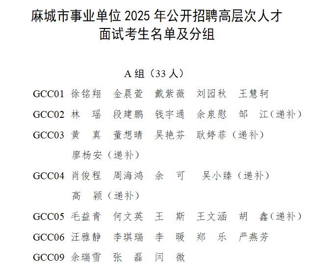 根据《麻城市事业单位2025年公开招聘引进高层次人才公告》,经过报名、资格初审、笔试(部分岗位)、资格复审等环节,确认131人取得面试资格(其中卫生系列39人,其他综合系列67人,名单及分组见附件;教育系列25人,面试单独举行,面试时间地点等具体事宜另行公告)。现将卫生系列、综合系列岗位面试工作有关事项公告如下: