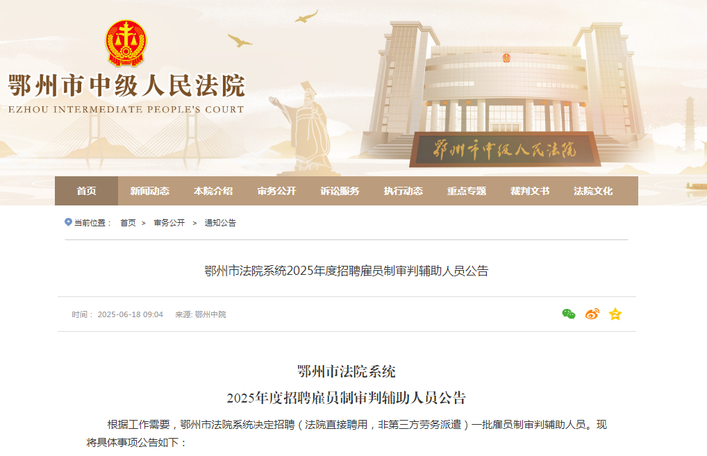 已结束 【合同制】鄂州市法院系统2025年度招聘雇员制审判辅助人员公告(招若干人,06月18日~07月03日报名)
