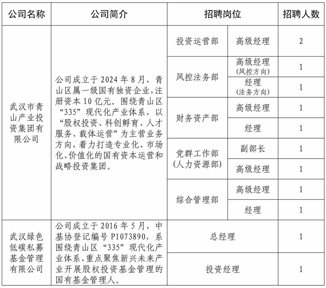 本次面向社会招聘涉及武汉市青山产业投资集团有限公司和武汉绿色低碳私募基金管理有限公司,共11个岗位12人。