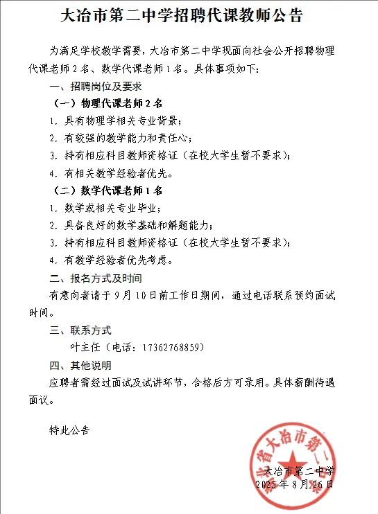 标签: 大冶市第二中学 代课教师招聘 招聘公告 教学岗位 代课教师考试