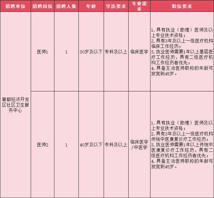 根据年度招聘计划以及工作开展需要,曾都经济开发区社区卫生服务中心现面向社会公开自主招聘医疗专业技术人员2名,现将有关事项公告如下: