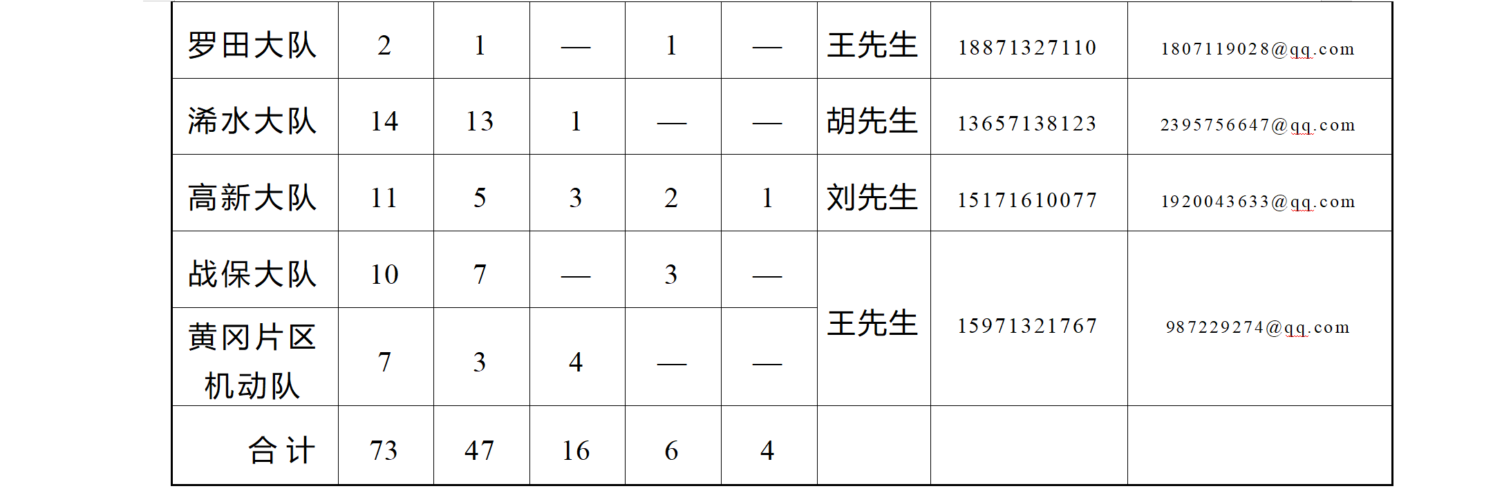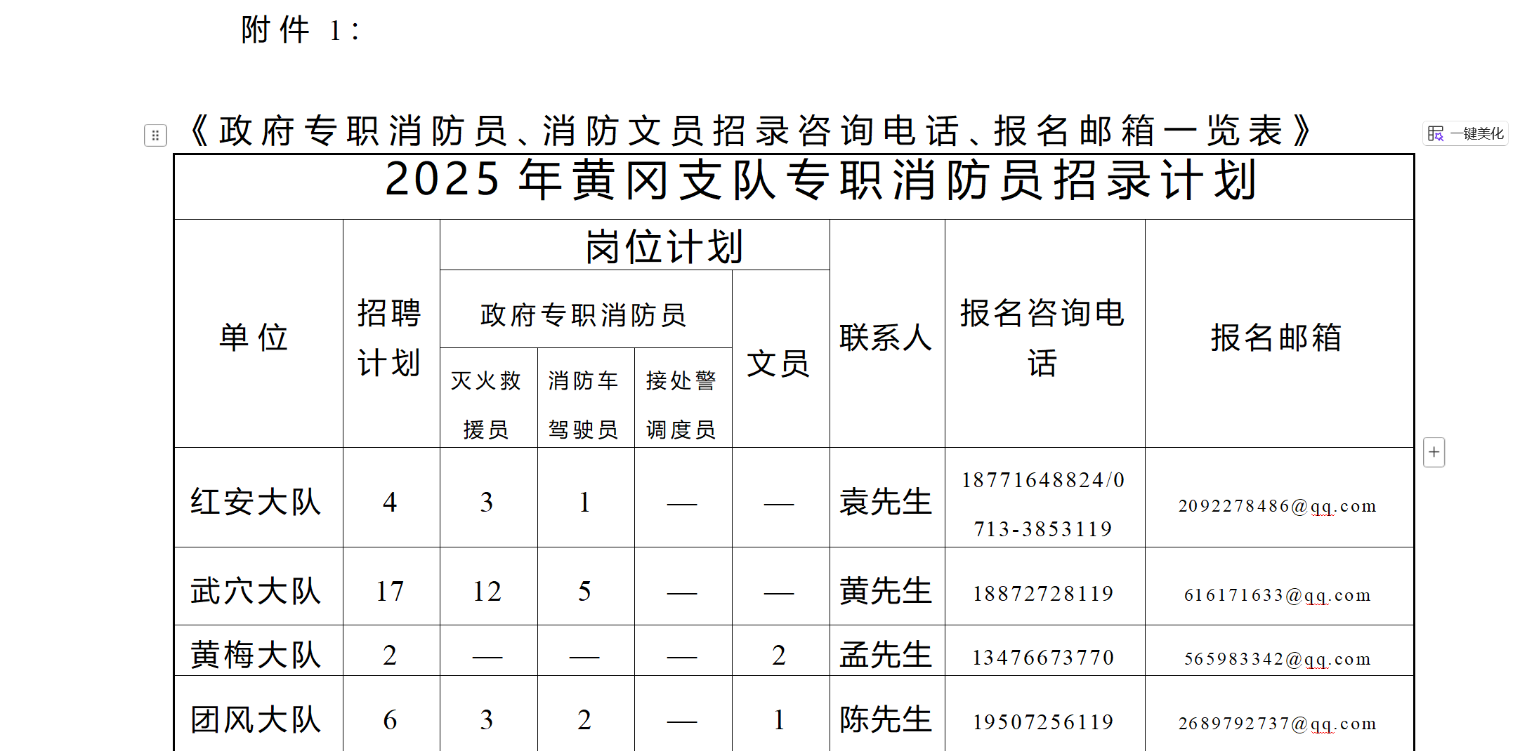 附件1 《政府专职消防员、消防文员招录咨询电话、报名邮箱一览表》