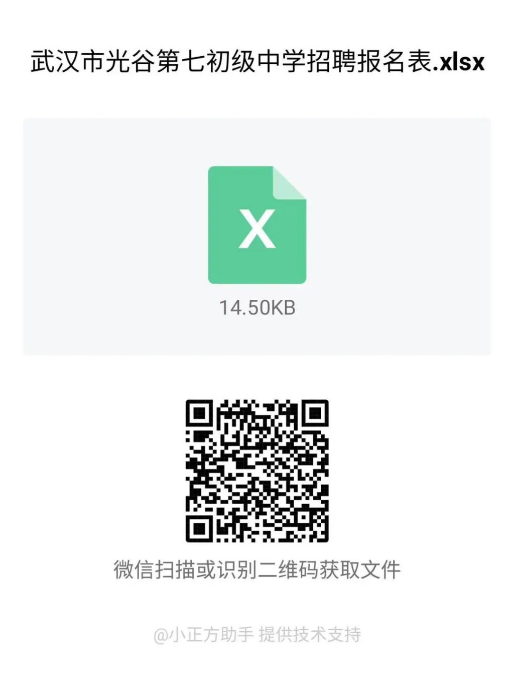 2、在线报名:请应聘人员扫描二维码下载填写《武汉市光谷第七初级中学招聘报名表》,将个人简历、身份证、学历学位证、教师资格证、普通话等级证、无犯罪证明及相关荣誉证书电子版(照片),整合编辑到一份PPT或PDF的文件中,和报名表一起压缩打包,以“学科+姓名+手机号码”的命名方式,发送到邮箱841462572@qq.com,同时面试当天需持以上证件原件和报名表接受现场审核。