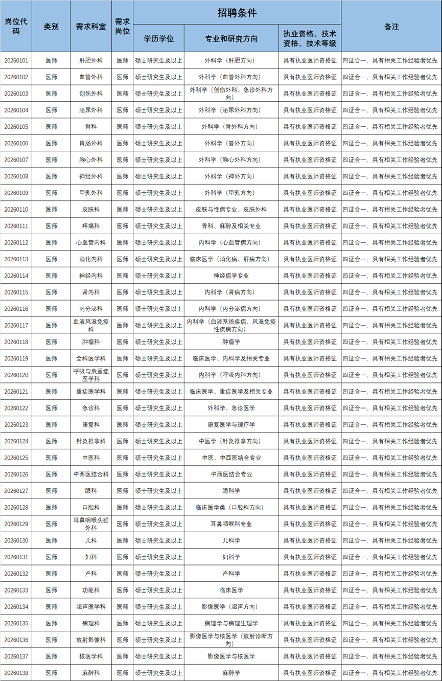 根据医院“一院多区”的建设规划及临床业务发展需求,现面向社会和高校,招聘临床医师、医学博士和学科骨干。具体岗位及条件如下:
