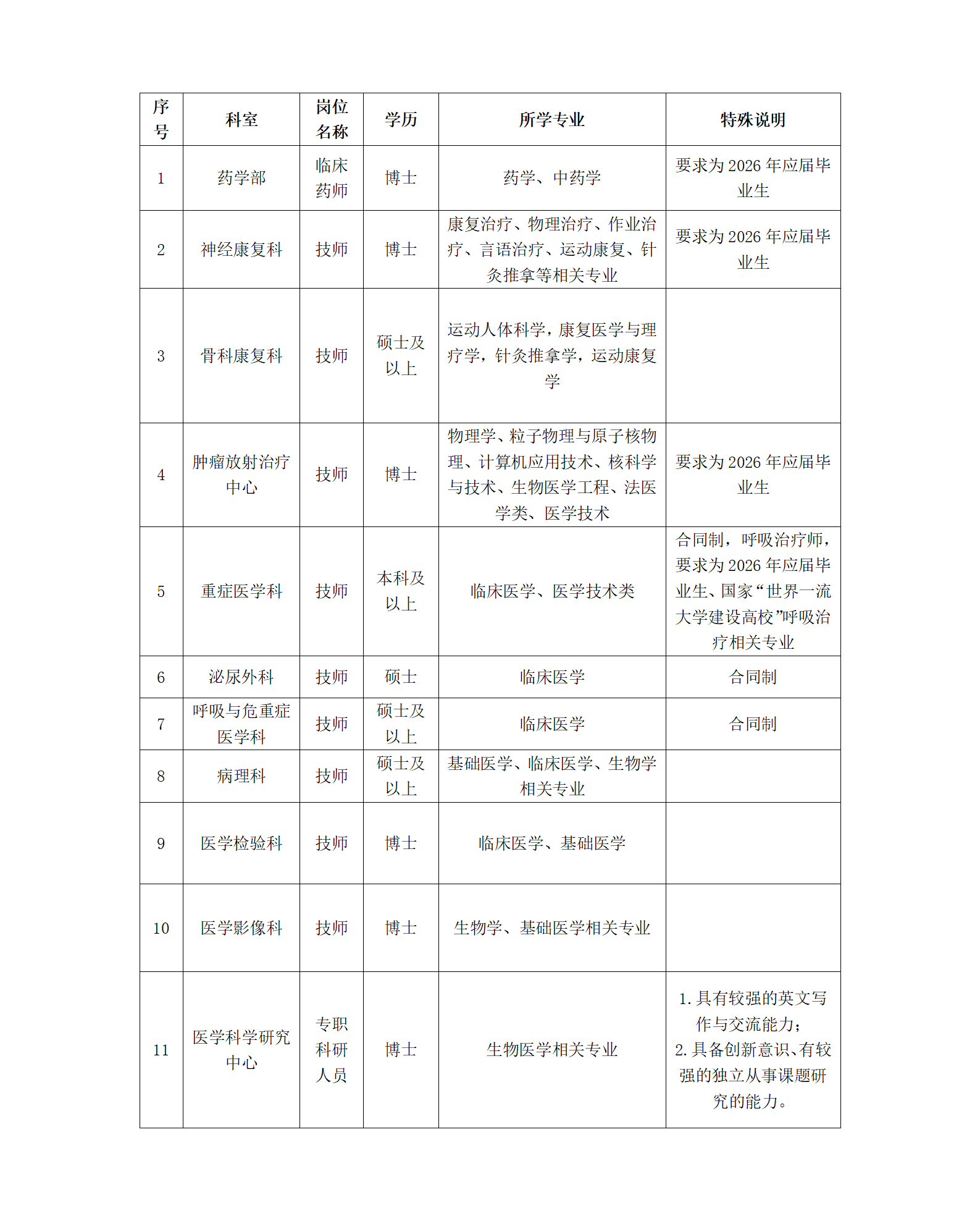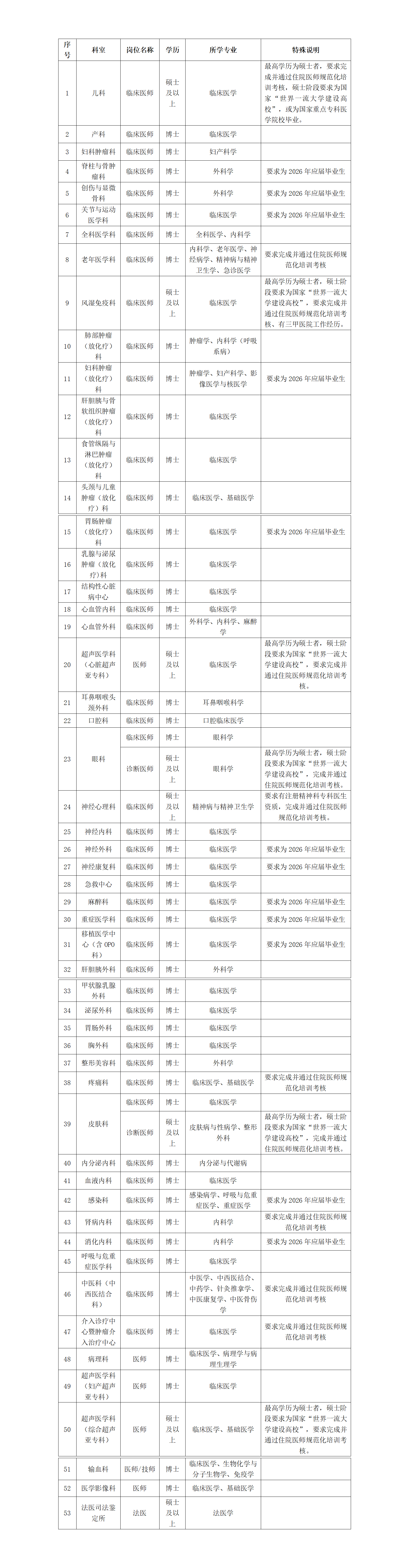注:1、临床医学八年制博士毕业生可不受专业限制,应聘各科室。