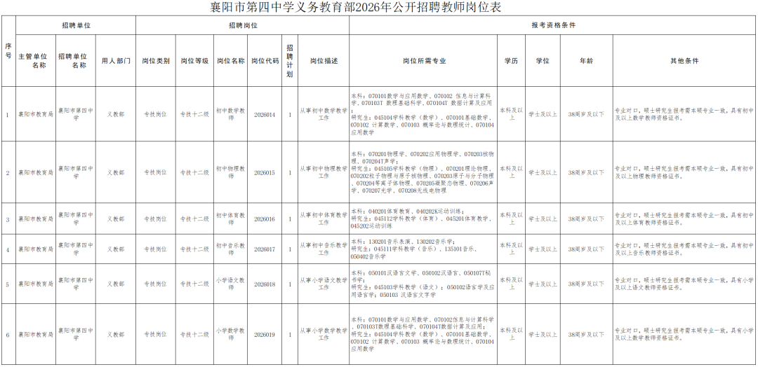本次招聘的岗位、资格条件详见《襄阳市第四中学义务教育部2026年公开招聘教师岗位表》。